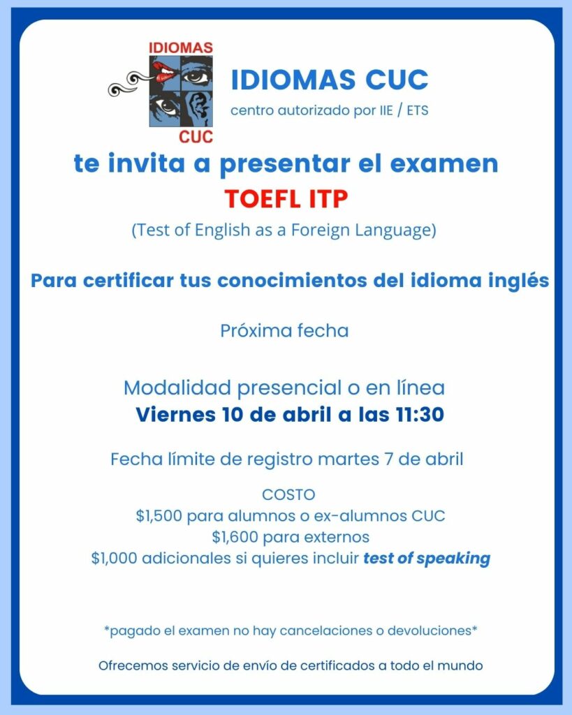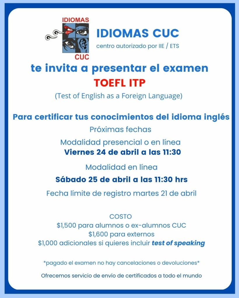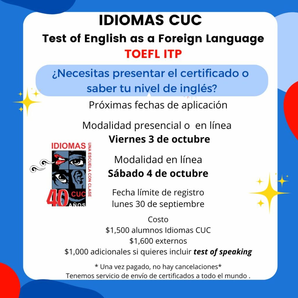 El examen de colocación no tiene costo. Se solicita a info@idiomascuc.com indicando nombre completo, idioma que se quiere presentar y teléfono.